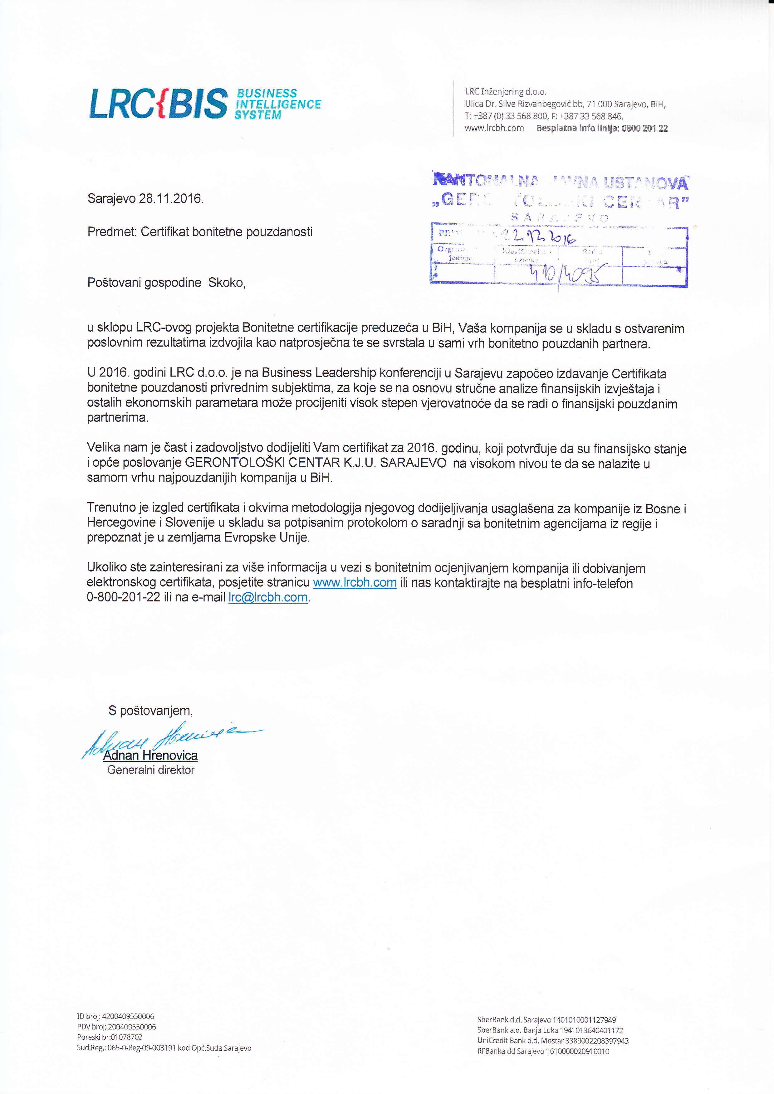 Tom prilikom KJU "Gerontološki centar" Sarajevo je dodjeljen certifikat za 2016. godinu koji potvrđuje da su finansijsko stanje i opće poslovanje na visokom nivou, te da se nalazimo u samom vrhu najpouzdanijih kompanija u BiH.