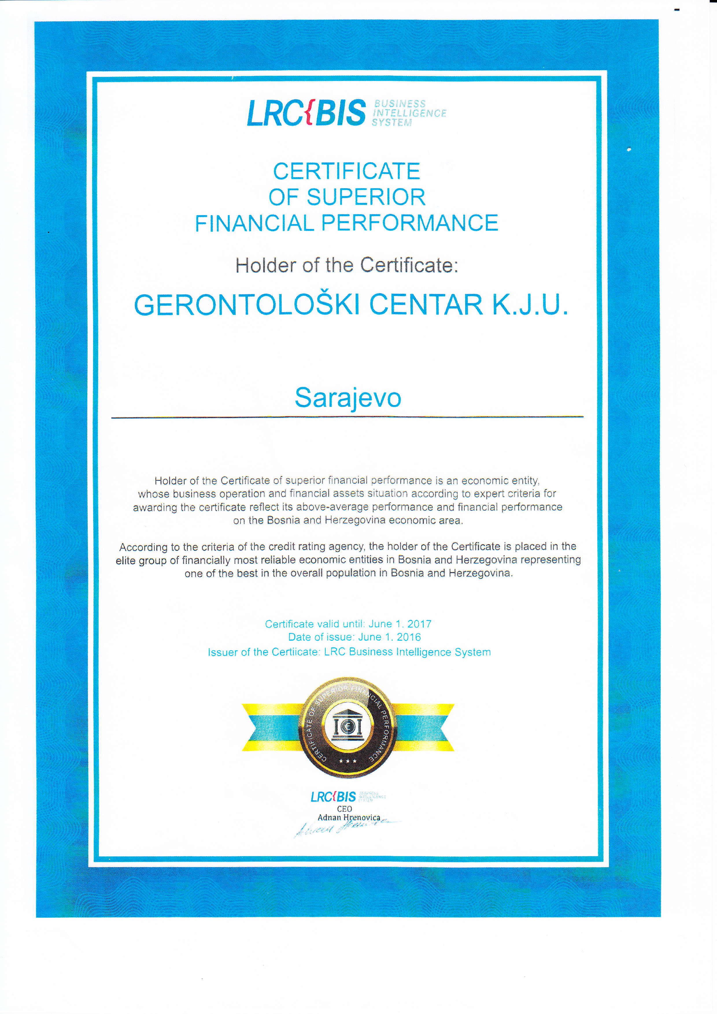 U sklopu LRC-ovog projekta Bonittetne certifikacije preduzeća u BiH, KJU "Gerontološki centar" Sarajevo se u skladu s ostvarenim poslovnim rezultatima