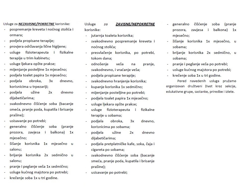 - zdravstvene (primarna zdravstvena zaštita korisnika, osnovna i specifična njega, usluge fizioterapeuta, održavanje lične higijene korisnika i farmakoterapija);